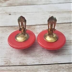Vintage Clip On Earrings Large Red Square Pattern 1.25" Circle Shape