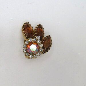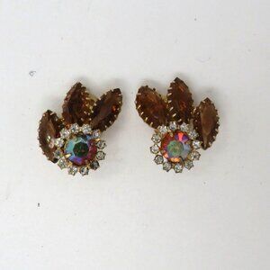 Vintage Clip On Earrings Rootbeer Brown Aurora Borealis Rhinestone Prong Setting