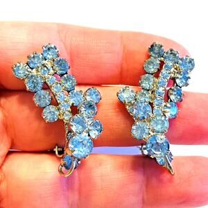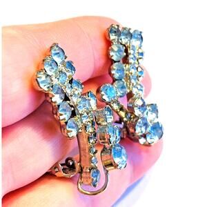 Vintage mid century clip-on earrings - dramatic and sparkling - silvertone & light blue rhinestones in a dimensional setting. A unique yet classic look - very elegant - these will pair perfectly with any dressy outfit. No hallmarks - nice quality fashion jewelry from the 1950's. In excellent vintage condition - minor surface wear - no damage or flaws - just stunning!