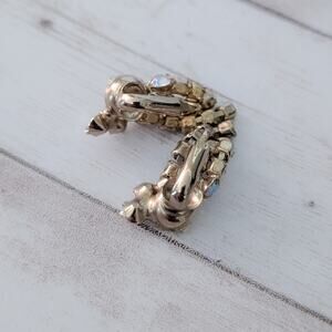 These earrings measure about 1 & 3/8". Top gems curve in a bit on one earring. Some marks and signs of wear. I am unsure of the material of the gems; however, there are none missing.