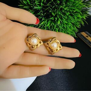 Vintage Clip on Earrings Gold Tone Faux Pearl Square Celtic Wave Pierced 4280