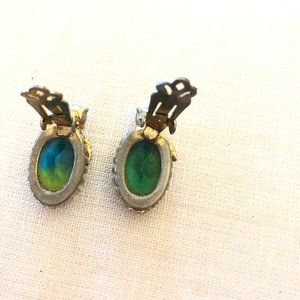 Beautiful Large Green Stone Vintage Clip On Earrings with Gold Leaves....