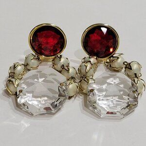 Vintage Clip-On Chandelier Earrings Red Gem Faux Pearl Accents & Crystal Drops