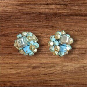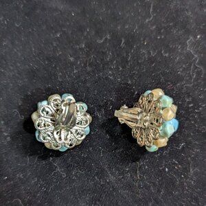 Vintage Clip-On Earrings W/ Blue & Cream Beads Japan Retro Chic 1"