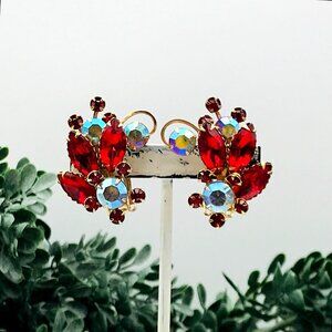 Elegant vintage clip-on earrings featuring vibrant red and shimmering aurora borealis rhinestones, set in gold-tone metal. A timeless addition to any jewelry collection.
