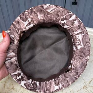 Vintage Cloche-Style Brown Printed Hat with Orange Ribbon and Bow, Medium Fit
