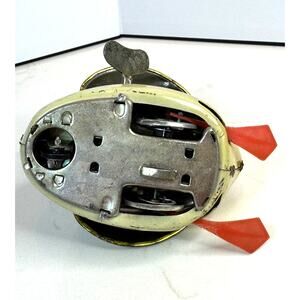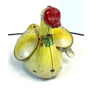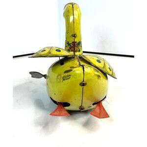This cute vintage tin with lithographed details has its original rubber palmate feet. The duck still operates by winding the key to start the duck waddling and flapping its wings. This toy was made in China and is stamped under the right wing. There is surface wear and scratching; the feet have no cracking or splits in the plastic. Please review all photos and make inquiries before purchasing. Sold items ship within one (1) business day.