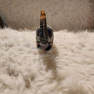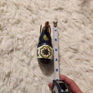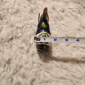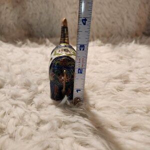 This vintage cloisonné elephant figurine showcases intricate enamel work and gold accents. A beautiful collector's item, it measures approximately 4 inches in length.