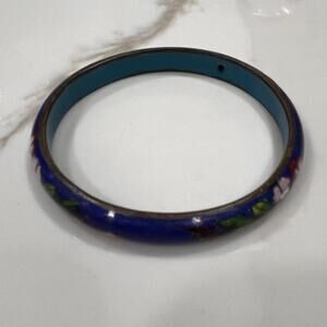 This vintage cloisonné enamel bangle features a vivid cobalt blue background adorned with delicate hand-painted floral designs in pink, green, and red. The bangle is crafted in the traditional cloisonné technique, with colored enamel inlaid between fine wire designs, then kiln-fired for a glossy, durable finish. A beautiful piece of wearable art, perfect for collectors or anyone who loves unique, bohemian jewelry.