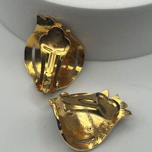 Striking pair of vintage cloisonné enamel clip-on earrings featuring vibrant red enamel with multicolor floral and butterfly designs outlined in gold tone. Unique dimensional shape adds depth and elegance.