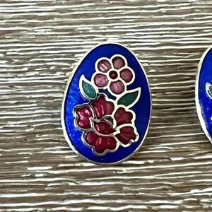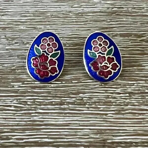 Vintage Cloisonné Enamel Floral Studs Oval Egg Shape Gold Tone Earrings Blue Red