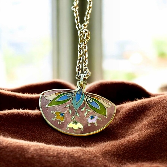 Vintage cloisonné necklace with fan-shaped pendant including floral designs. The applied enamel colors have symbolic meanings, such as red for luck, blue for peace, and green for prosperity