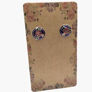 Vintage Cloisonné Flower Stud Earrings Round Blue Pink Enamel