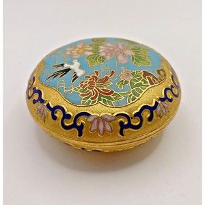 Vintage Cloisonné Gold Bird Floral Flowers Lidded Trinket Box Dish Used