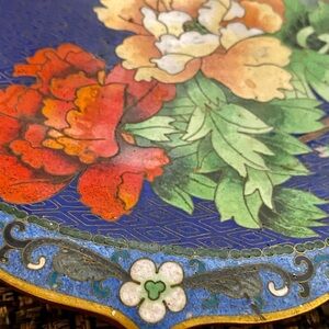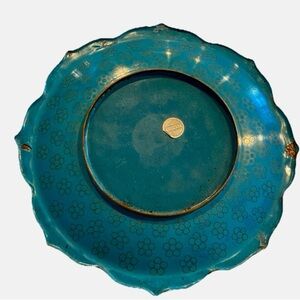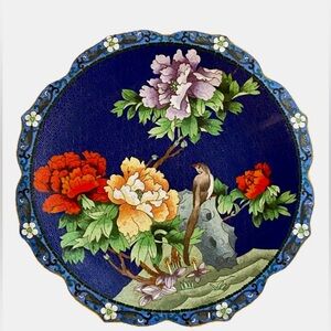 Vintage Cloisonné Plate Gold Scallop Trim On Blue, With Bird And Blossoms, 12”