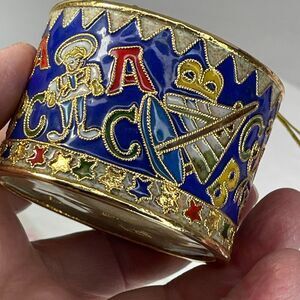 Vintage Cloisonné drum and sticks ornament. Bright and in beautiful shape. Not sure what type of hallmark is on bottom.