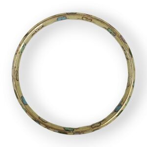 Thin round cloisonne bangle with a multicolored flower design outlined in gold tone brass over a beige resin? base