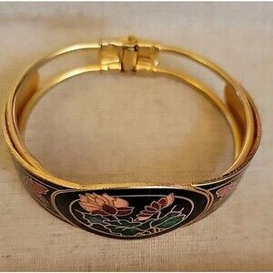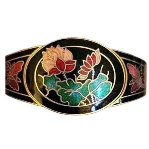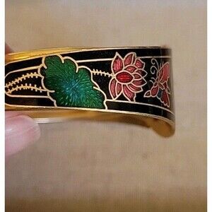 Add a touch of vintage charm to your wrist with this beautiful cloisonne bangle bracelet. The intricate lotus floral design with butterflies will surely catch the eye of anyone who sees it. The bracelet's gold tone color adds to its elegance and will complement any outfit.