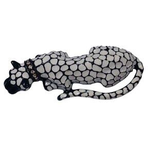 This exquisite vintage brooch features a Siamese cat design with intricate cloisonné detailing, adorned with black and white crystals and striking green eyes. A charming accessory that adds elegance to any outfit, perfect for cat lovers and vintage jewelry enthusiasts.