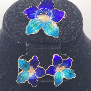 Vintage Cloissoine Demi Parure Floral Blue Enamel Earring & Brooch Pin 1.75in