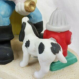 It is a clown fireman trying to connect the water hose to a hydrant with a dog looking up at him