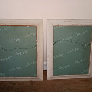 The stuff of nightmares! Pair of creepy vintage clown paintings (likely acrylic) on board from 1961. Signed W. McGowen. Good used condition. Some missing paint and distressing along the frames, marks along the back. I have dusted the paintings but you may want to risk further cleaning. Paintings measure 15.5" x 20." Very well done, great for a funhouse or midcentury maximalist house, or if you want to creep out all your visitors. Sold from a cigarette and pet hair free home.