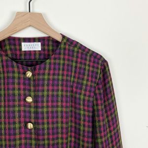 Peep this INCREDIBLE vintage beauty by Cristy Girl New York. Not only is this gem made in the USA, but it also SCREAMS 1980s mean girl with a small dose of Clueless vibes. Gold toned buttons are magically complimentary to the bright pink, purple, and green plaid jacket. Cleverly placed darting at the waistline provides a flattering fit. Additional darting on sleeves. Perfectly soft, comfortable, and lightweight.