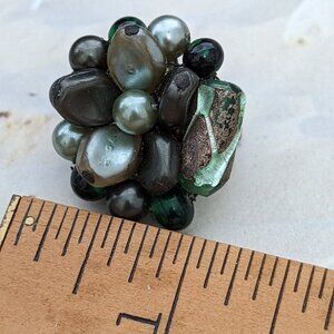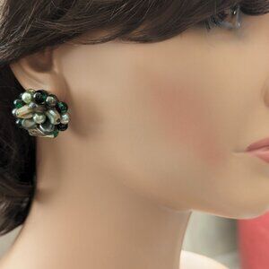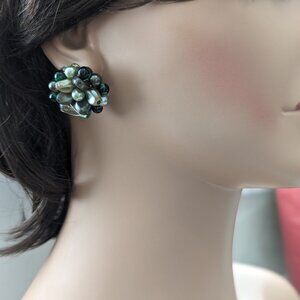 Vintage Cluster Beaded CLIP-ON Earrigns Glass Art Antique Beads Silvery Grey mix
