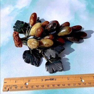 Add a touch of mid-century charm to your home with this vintage cluster of jade and other semi-precious stone grapes. Very realistic stone grapes with carved jade grape leaves, wire tendrils, and a sculpted glazed stem. Each grape is so unique, and the silk green wire wrap allows the buyer to bend/arrange the grapes and leaves to their liking. This striking cluster of multi-colored grapes is approximately 7 inches long, 7 inches wide and 2 1/2 inches tall. This estate sale find is in excellent vintage condition with no cracks, chips, breaks or repairs.
