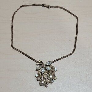The necklace features a thin, bronze-toned curb chain with a simple spring ring clasp. The central pendant is a clustered floral design with a bow. The bow is adorned with three clear, leaf-shaped rhinestones or crystals. The flowers are represented by a cluster of small, round, off-white beads that resemble pearls, interspersed with small, round, clear and colorful rhinestones. The entire pendant has a vintage or antique appearance.