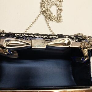 This vintage clutch evening bag is a glamorous accessory perfect for special occasions such as proms, weddings, or parties. The blue and silver sequins give it a luxurious and elegant look, reminiscent of the 1980s when it was made. Its compact size and clutch style make it easy to carry and ideal for adding a touch of glamour to any outfit. Perfect for those looking to make a statement with their handbag at evening events.