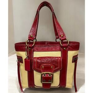 This Vintage Coach 113 Legacy Straw Tote Bag and Wristlet set from 2005 is just perfect for summer! Featuring natural woven straw with red crinkled glazed leather trim and antique brass hardware, this rare to find matched set is just as stylish and sought after today as it was 20 years ago. If you love preppy, Y2K Vintage Coach design, you need this set in your collection!