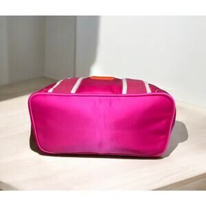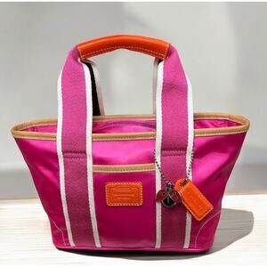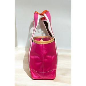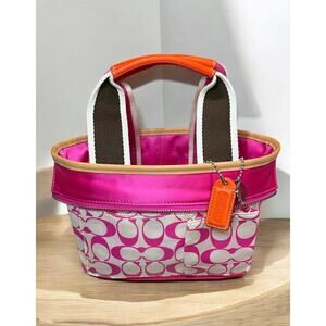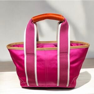 This Vintage Coach 1893 Reversable Mini Hamptons Signature Tote Bag from 2004 is just adorable! Featuring hot pink satin with orange and natural leather trim on one side and white and hot pink signature satin on the other side, this mini tote is like having two bags in one and comes with a super cute lady bug charm. If you love vintage, preppy, classic Coach then this is a must have for your collection!