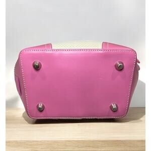 Condition – Good vintage condition. Some discoloration/wear/marks on the leather handles and trim (mainly on the pink side and can be reversed) and minor wear on the bottom corners. The wristlet is missing the zipper pull. Some wear is to be expected for a vintage bag.