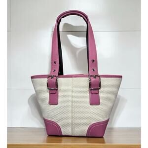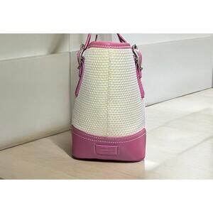 This Vintage Coach 4467 Woven Straw Mini Tote and Matching Wristlet from 2004 is just adorable! Featuring off-white woven straw with rose pink/brown leather trim and reversable handles, this little tote and wristlet is perfect when you want to travel light and the adjustable strap allows for hand or shoulder wear. If you love vintage, preppy, classic Coach then this is a must have for your collection!