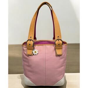 This Vintage Coach 5174 Soho Daisy Canvas Tote and Wristlet from 2004 is the perfect set for Spring and Summer! Featuring light pink canvas, vachetta and pink reversable handles with white bottom trim and an adorable daisy charm, this large bag is just as fashionable today as it was over 20 years ago. If you love Y2K, vintage Coach this is a must have for your Coach collection!