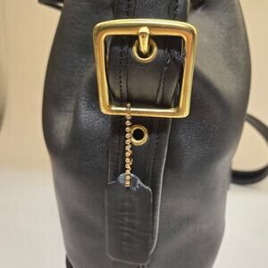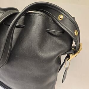 Vintage Y2K 2000 Lula's Legacy black leather drawstring bucket shoulder or crossbody bag. Made in USA. Style no. B0D-9952. Brass hardware. Drawstring closure. One open pocket in the unlined interior. Thick leather strap is adjustable and removable. Leather Coach hang tag. In excellent pre-owned vintage condition. Super soft leather with minimal signs of wear, as shown.