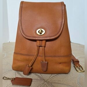 Vintage Coach, 9960, small backpack in British Tan. Straps need to be sewn on, please see the last 2 pictures. There are stains, not ink, but something that has hardened. They can also be seen on the inside of the bag . I have not tried to remove them. Corners have wear but piping is not exposed. Made in Costa Rica, vintage from 1999, leather is soft and supple. Original hangtag with brass chain is included!