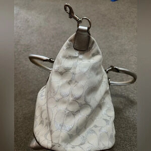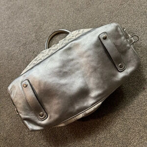 Good condition fabric & leather silver logo Coach satchel. Stains on the inner of the handles but the leather is in good condition. One interior patch pocket & one zippered pocket. 12 1/2” wide x 8 1/2” high x 6” deep. Overall clean interior and exterior. Doesn’t come with shoulder straps.