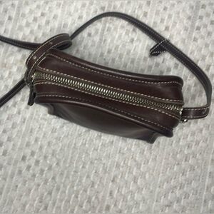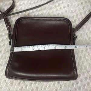 Embossed "Coach" on exterior along with classic brown hangtag. Single adjustable strap with drip. Raw leather interior with 1 slip pocket.