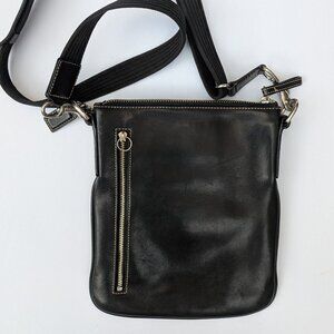 Crafted in smooth black leather with contrast stitching, this vintage Coach crossbody bag embodies timeless minimalist style. Compact yet practical, it features a signature front pocket with buckle detail and silver-tone hardware that gives it a refined, structured look. The adjustable webbed strap with leather shoulder pad adds comfort and durability for everyday wear.
