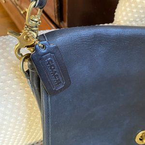 Vintage Coach Black Leather Handbag with Unique Serial Number 301-7510 which appears on only one bag - This iconic black Coach handbag from the 1980's is made from luxurious glove tanned cowhide. Unlike newer bags there is no style number on the Creed (see next paragraph for more information on the Creed). The front of the bag has a brass closure. The bag had a removable shoulder strap that attaches to the brass rings on the side of the bag by a sturdy brass clasp. Inside the bag there is a zipper compartment at the back of the bag and an open pocket at the front - perfect for storage of your cell phone! The bag measures approximately 11" wide, 6" tall, and 3" deep. The strap from the tip of the brass clasp to the tip of the other brass clasp is approximately 38” and the leather part of the strap is 34” in length. This bag has had a single owner and is in good condition. This bag is made to last (see photos).
