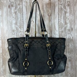 Preowned in good condition. Coach double strap shoulder bag. Black jacquard canvas with gold hardware, leather straps. In good preowned condition.