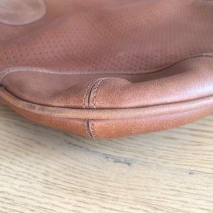 Authentic brown perforated leather Coach bucket bag. Gently used with minimal scuffing. As shown in photos - no holes or stains, adjustable strap by buckle with a max 12" drop, bag is 12.5" H, 14.5" W and 3" D. It features original Coach hangtag, brass accents, thick brass zipper opening, 1 inside zipper pocket and a beautiful perforated leather. It was made in the USA (most Coaches are made overseas nowadays) and the No. is KOD-9218. Thank you!