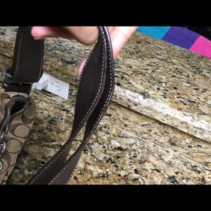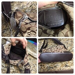 Coach bag, I have used it a lot and It does show signs of use (please see pictures). There is definitely some wear on the bottom & wear on the strap. There are scuff marks & wear on the strap. The lining on the inside is a dark brown and in perfect condition.
