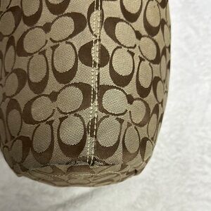 This Coach #11437 shoulder - Crossbody bag showcases a sophisticated brown color with the iconic 'C' monogram pattern, exuding timeless elegance. Crafted with premium brown leather trim and a single shoulder strap, it offers both style and functionality. The medium to large size is ideal for daily use, complemented by brass-tone hardware for a refined finish. I have not cleaned leather no rips. See all photos as they are part of description