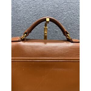 The Vintage Coach Business Bag in British Tan is a classic and stylish rectangular briefcase made of leather with gold hardware accents. It features a turn lock closure, brown leather crossbody strap handle, and multiple inner and outer pockets for organization. This large-sized bag with detachable strap, bag charm, and lock is perfect for business occasions and showcases a solid brown exterior with a matte finish. The Coach brand adds a touch of designer heritage, making it a timeless piece for the modern woman seeking a blend of vintage charm and functionality.
