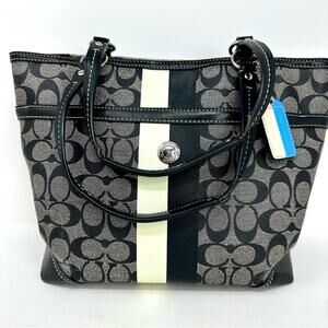 Item in Good Preowned Condition. Leather, Racing stripes front accent, Some marks on interior, Original Coach tag, Satin lined in contrast sky blue, Three interior pockets, two exterior pockets, reinforced shoulder/Handles, Some wear on exterior and corners of bag, SEE PHOTOS.