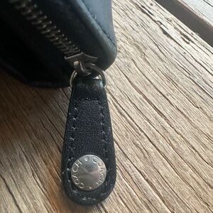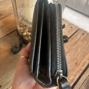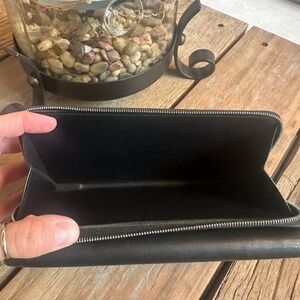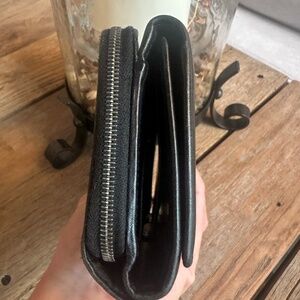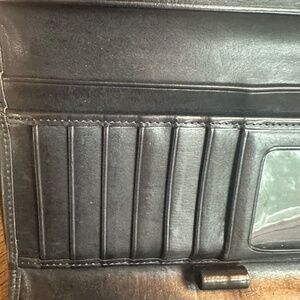 Details/Description: Black trifold wallet with 6 credit card slots, 4 multipurpose pockets, ID window, pocket for side or top bound checkbook, full length bill pocket, outside zip around coin compartment, pen loop, snap closure, glove tanned cowhide.