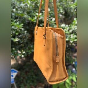 Super soft leather. No hangtag. Has some small stains (see pics) and wear on the bottom corners. Piping intact, no tears to inner fabric lining. No odors.